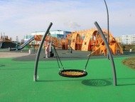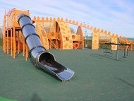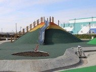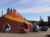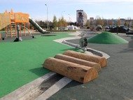 Ландшафт оформлен с геопластикой: холмы, вулкан, который одновременно горка и мини-скалодром, тропа в виде следов ящера, макет черепа динозавра, лавочки-рёбра, живой лабиринт.